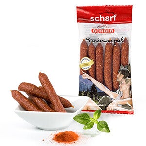 Rohwurst-Snack aus hochwertigem Schweinefleisch, gut gewürzt, mit Buchenholz geräuchert und langsam luftgetrocknet.
